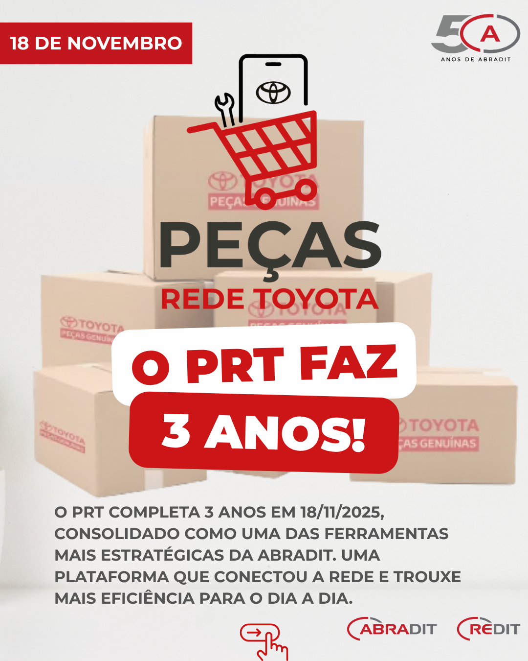 O e-commerce Peças Rede Toyota (PRT) completa 3 anos, levando mais agilidade, confiança e facilidade no acesso às peças Toyota. 🚗💨 Consolidado como uma das ferramentas mais estratégicas da ABRADIT,…