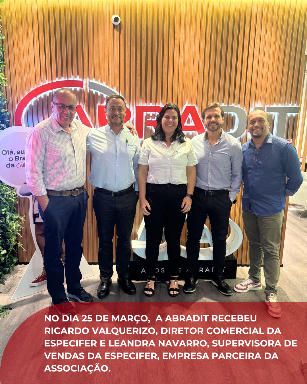 No dia 25 de março, a ABRADIT recebeu em sua sede 🤝 Ricardo Valquerizo, Diretor Comercial da Especifer, e Leandra Navarro, Supervisora de Vendas da Especifer, empresa parceira da Associação….