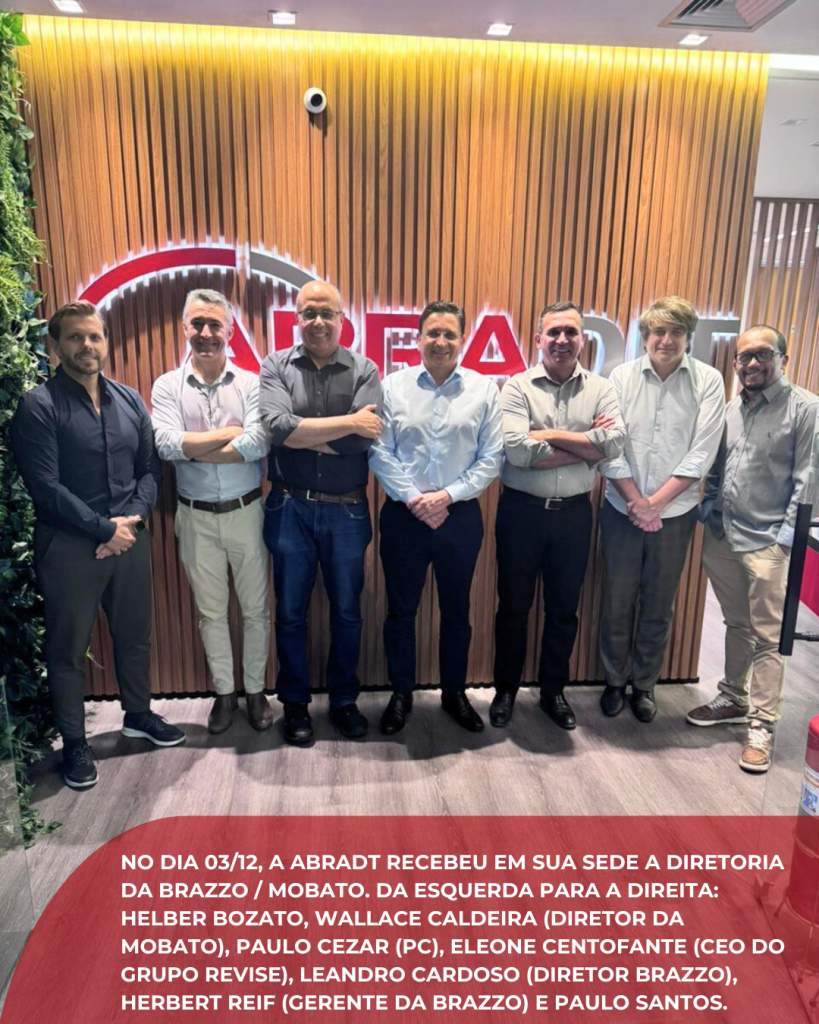 Já no dia 03/12, foi a vez da Diretoria da Brazzo / Mobato participar de um encontro com a quipe da ABRADIT. (a partir da esquerda) Helber Bozato, Wallace Caldeira (Diretor da Mobato), Paulo Cezar (PC), Eleone Centofante (CEO do Grupo Revise), Leandro Cardoso (Diretor da Brazzo), Herbert Reif (Gerente da Brazzo) e Paulo Santos.