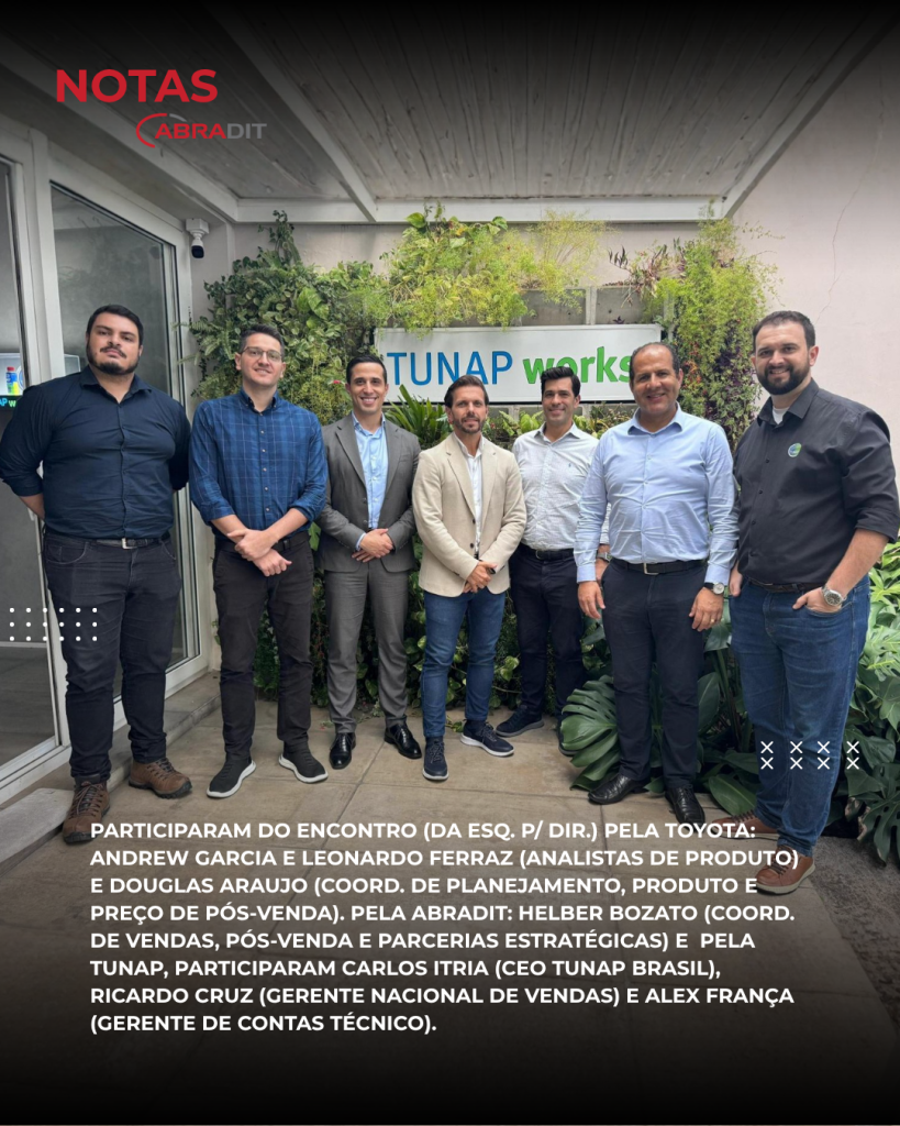 Participaram do encontro (da esq. p/ dir.) pela TOYOTA: Andrew Garcia e Leonardo Ferraz (Analistas de Produto) e Douglas Araujo (Coord. de Planejamento, Produto e Preço de Pós-venda). pela ABRADIT: Helber Bozato (Coord. de Vendas, Pós-venda e Parcerias Estratégicas) e Pela TUNAP, participaram Carlos Itria (CEO TUNAP Brasil), Ricardo Cruz (Gerente Nacional de Vendas) e Alex França (Gerente de Contas Técnico).